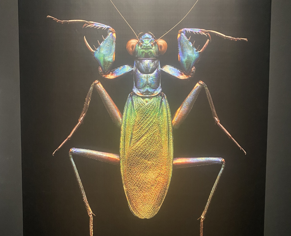 This is a photo I took at the exhibition. You can appreciate that even a tiny praying mantis can appear a serious predator when you focus on the minutia of its defining features.
